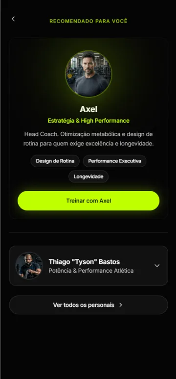 Cada pessoa treina diferente. Seu personal aprende com você: seu corpo, sua rotina, seus limites. E ajusta tudo para que o próximo passo seja sempre o certo.